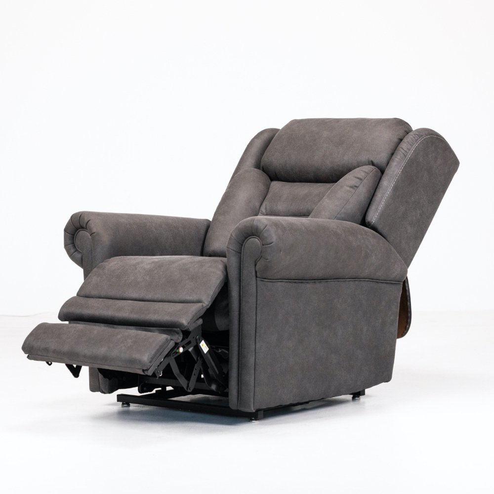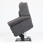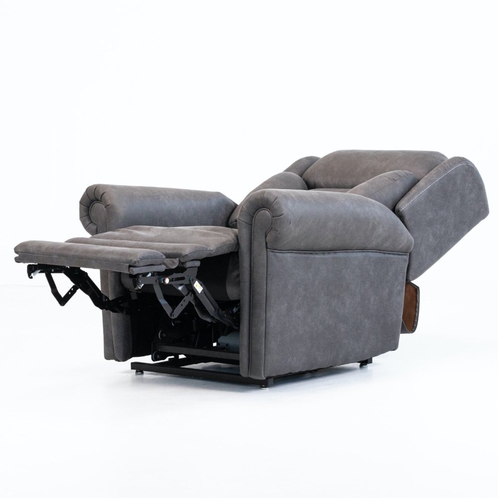 Lateral support backrest 4 independent motors for positioning of the headrest, lumbar, backrest and footrest. Two stage lift mechanism provides more vertical lift. Lay flat chair design. Footrest extension for increased comfort. Lumbar support to accommodate sitting posture.